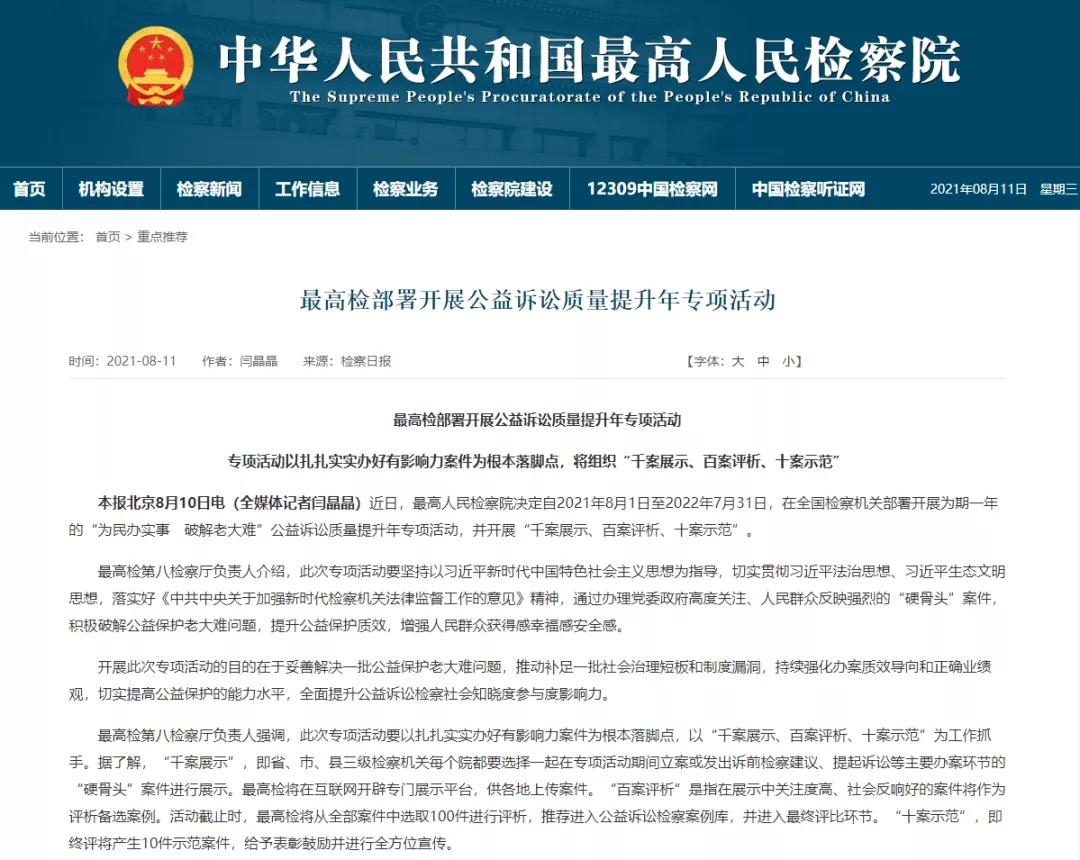 近日,最高人民检察院决定自2021年8月1日至2022年7月31日,在全国检察机关部署开展为期一年的“为民办实事,破解老大难”公益诉讼质量提升年专项活动。