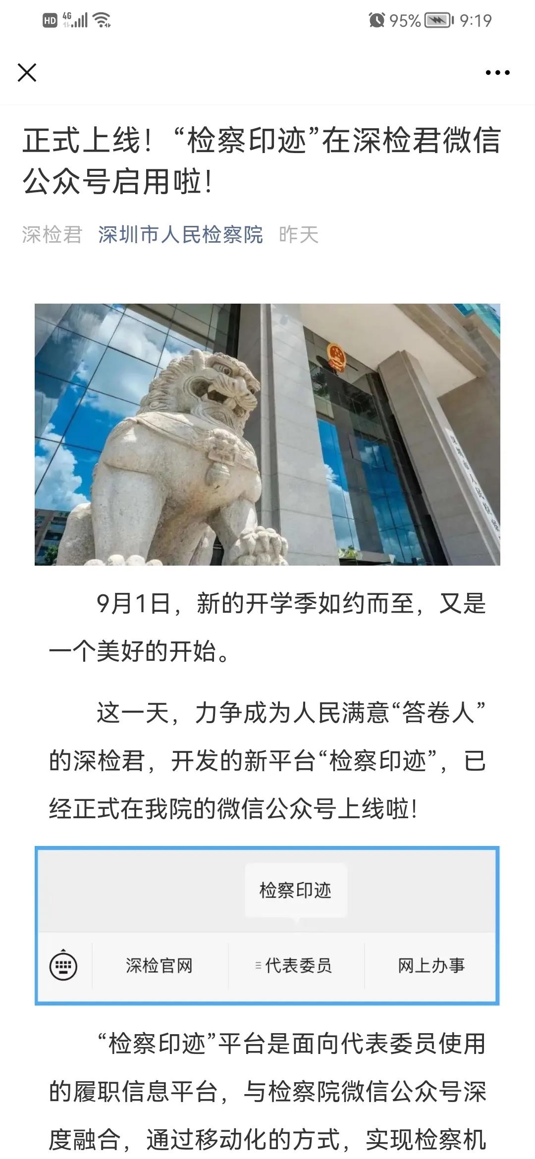 同时,代表委员可以随时随地提交建议议案和查看建议答复,实现问有所答。深圳市人民检察院在官方微信公众号对“检察印迹”进行了官方报道。