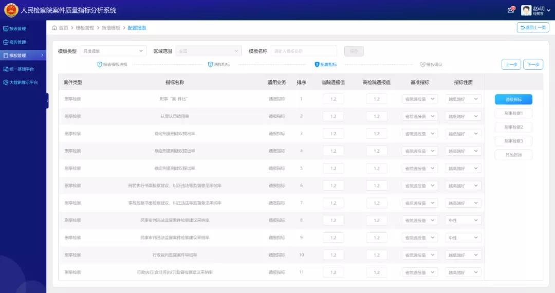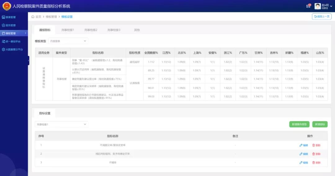 案件质量指标分析系统,摒弃人工计算“案件比”及核心业务数据排名,打造“人工智能+案件管理”的智慧管理体系,通过建设报表管理、分析报告管理、模板管理、大数据平台展示等系统功能,让业务数据价值得到充分挖掘,让业务数据真正“活”起来,发挥检务管理现代化“风向标”“指挥棒”作用。