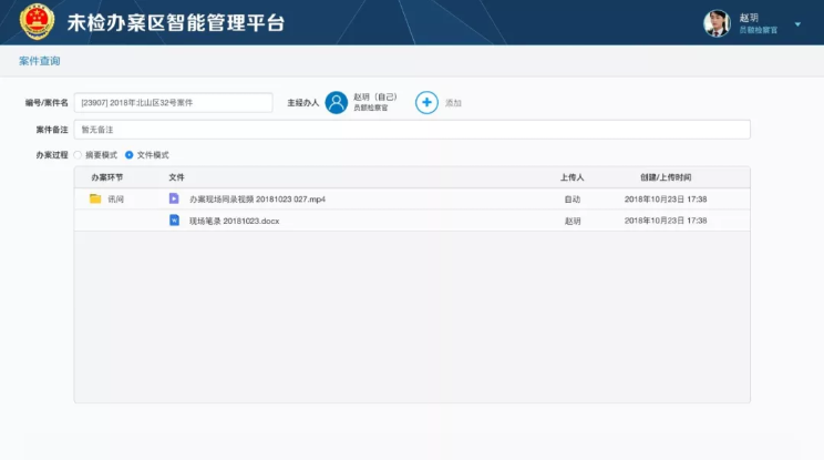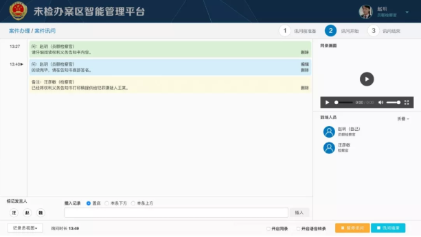 为未检工作的讯问、询问、训诫宣告、听证、心理咨询等不同的办案场景提供工作平台。通过现场同录、语音转写等技术手段,实现现场数据的采集和输出,提升办案人员效率、完整保存各类现场数据。