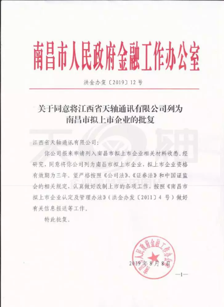 经各相关部门联合审核,南昌市人民政府金融工作办公室批准,天轴科技南昌公司(江西省天轴通讯有限公司)被正式列入南昌市拟上市企业,享受南昌市政府对于本区域内拟上市公司的相关扶持政策。这意味着公司在经营发展上取得了阶段性的成果。同时,表明了公司在打造我国政法与纪检监察信息化优秀品牌的道路上与推动企业上市进程中迈出了坚实的一步。