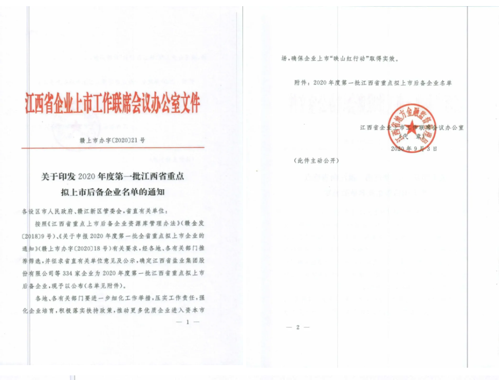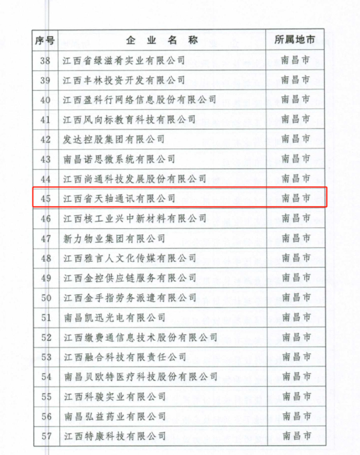 按照《江西省重点上市后备企业资源库管理办法》(赣金发[2018]9号)、《关于申报2020年度第一批全省重点拟上市企业的通知》(赣上市办字[2020]18号)有关要求, 经各相关部门联合审核,天轴科技南昌公司(江西省天轴通讯有限公司)被正式列入2020年度第一批江西省重点拟上市后备企业拟,享受相关扶持政策。