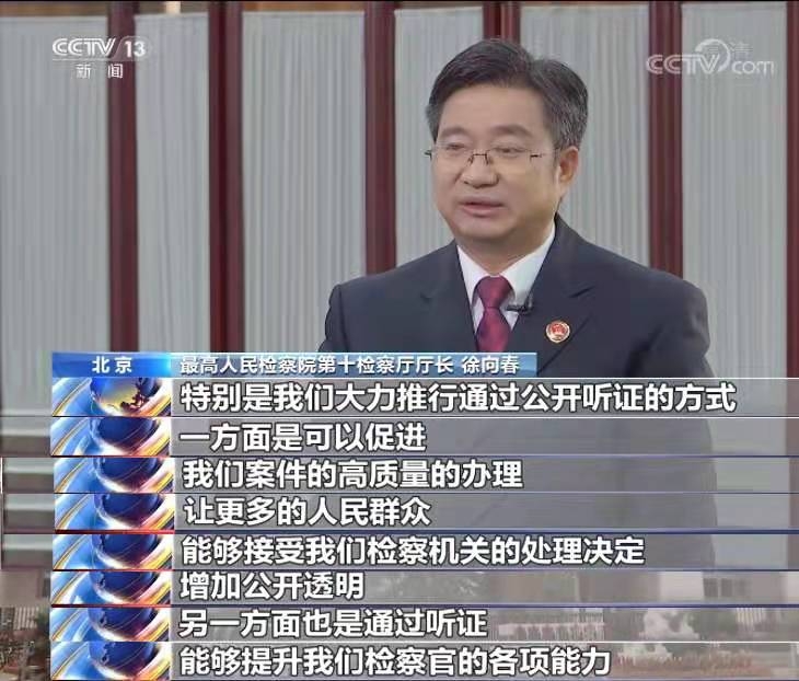 节目中最高人民检察院第十检察厅厅长徐向春接受了采访。徐厅长表示,用公开听证这种方式,来解决各类疑难复杂案件,已成为检察机关正大力推行一种办案方式。